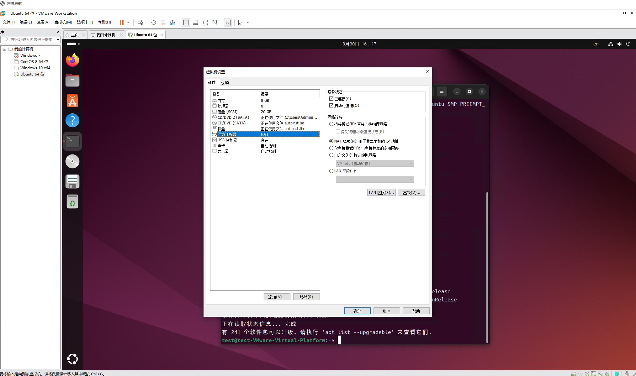 如果不能上网,将网络适配器改为nat模式