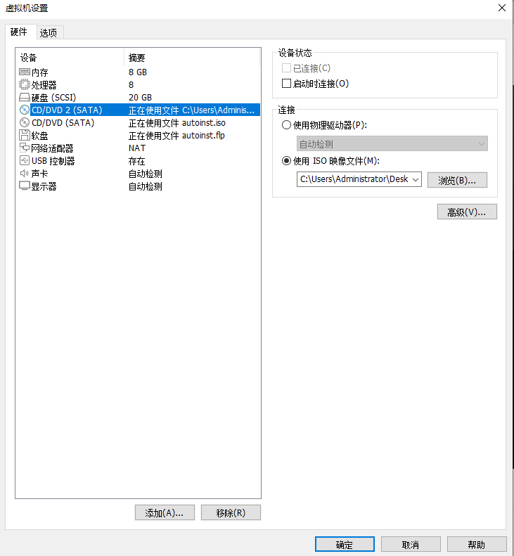 下一次启动前,将安装镜像的dvd的启动时连接选项取消勾选