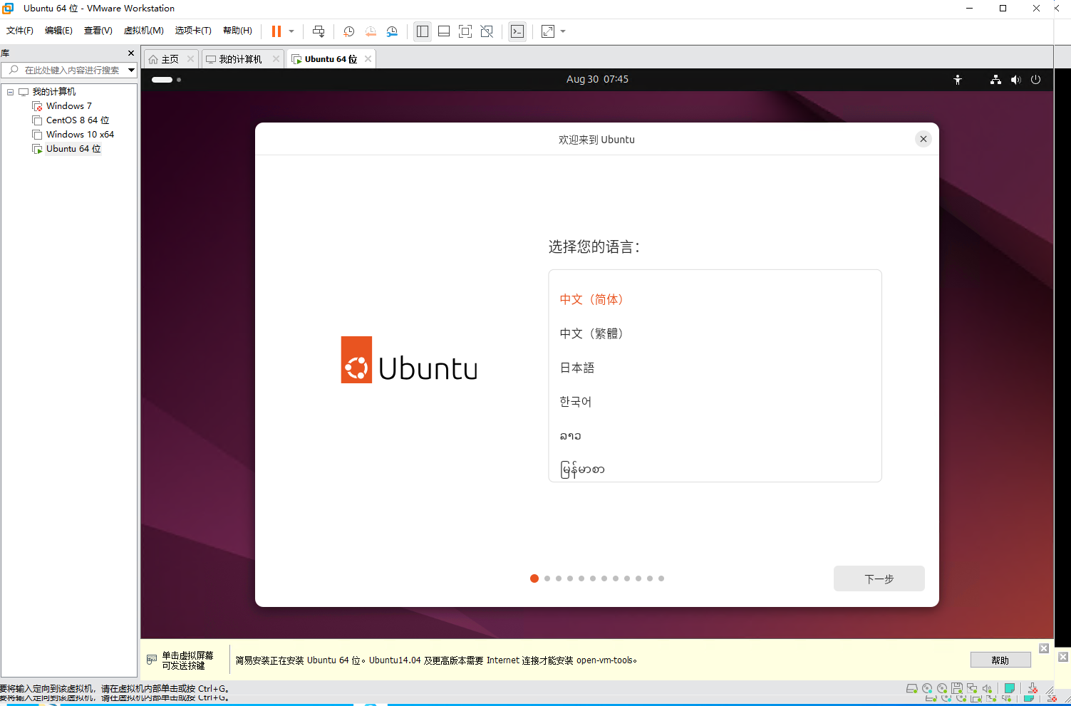 6、设置语言等,自定义即可,注意键盘选英语(美国),注意最后一步安装时间可能较长。